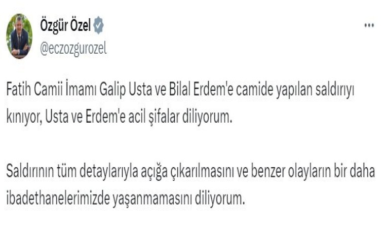 Cumhuriyet Halk Partisi (CHP) Genel Başkanı Özgür Özel, “Fatih Camii İmamı Galip Usta ve Bilal Erdem’e camide yapılan saldırıyı kınıyorum” dedi.