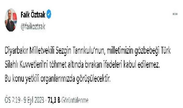 ANKARA, (DHA)- CHP Parti Sözcüsü Faik Öztrak, CHP Diyarbakır Milletvekili Sezgin Tanrıkulu’nun açıklamaları hakkında, ”Diyarbakır Milletvekili Sezgin Tanrıkulu’nun, milletimizin gözbebeği Türk Silahlı Kuvvetleri’ni töhmet altında bırakan ifadeleri kabul edilemez” dedi.