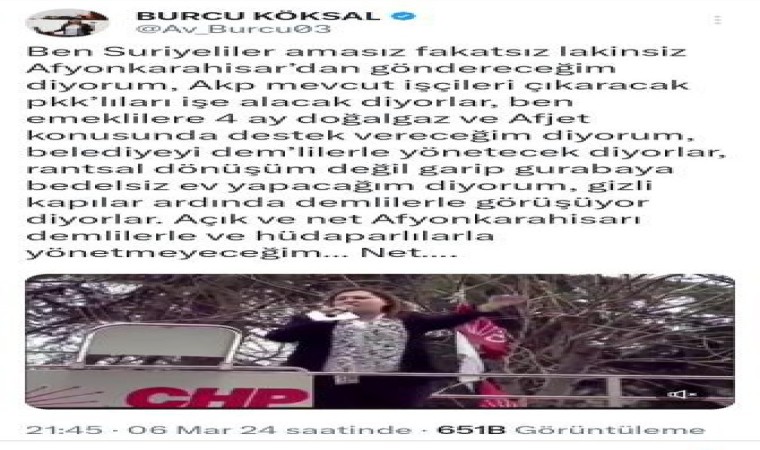 Karşılıklı söylemlerinin ardından sosyal medya hesabından bir açıklama yapan Köksal ise “Ben Suriyeliler amasız fakatsız lakinsiz Afyonkarahisar’dan göndereceğim diyorum, AKP mevcut işçileri çıkaracak PKK’lıları işe alacak diyorlar, ben emeklilere 4 ay doğalgaz ve AFJET konusunda destek vereceğim diyorum. Belediyeyi DEM’lilerle yönetecek diyorlar, rantsal dönüşüm değil garip gurabaya bedelsiz ev yapacağım diyorum. Gizli kapılar ardında DEM’lilerle görüşüyor diyorlar. Açık ve net Afyonkarahisar’ı DEM’lilerle ve HÜDAPAR’lılarla yönetmeyeceğim. Net” şeklinde bir açıklama yaparak, sözlerinin arkasında durduğunu gösterdi.