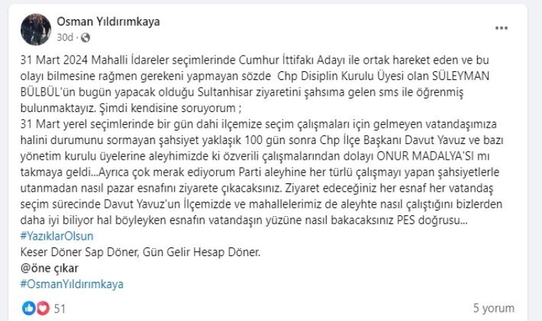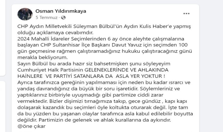CHP’li Yıldırımkaya sosyal medya paylaşımında, “31 Mart 2024 Mahalli İdareler seçimlerinde Cumhur İttifakı adayı ile ortak hareket eden ve bu olayı bilmesine rağmen gerekeni yapmayan sözde CHP Disiplin Kurulu Üyesi olan Süleyman Bülbül’ün bugün yapacak olduğu Sultanhisar ziyaretini şahsıma gelen SMS ile öğrenmiş bulunmaktayız. Şimdi kendisine soruyorum; 31 Mart yerel seçimlerinde bir gün dahi ilçemize seçim çalışmaları için gelmeyen, vatandaşımıza halini, durumunu sormayan şahsiyet yaklaşık 100 gün sonra CHP İlçe Başkanı Davut Yavuz ve bazı yönetim kurulu üyelerine aleyhimizdeki özverili çalışmalarından dolayı onur madalyası takmaya geldi. Ayrıca çok merak ediyorum parti aleyhine her türlü çalışmayı yapan şahsiyetlerle utanmadan nasıl pazar esnafını ziyarete çıkacaksınız. Ziyaret edeceğiniz her esnaf her vatandaş seçim sürecinde Davut Yavuz’un ilçemizde ve mahallelerimiz de aleyhte nasıl çalıştığını bizlerden daha iyi biliyor, hal böyleyken esnafın, vatandaşın yüzüne nasıl bakacaksınız. Pes doğrusu. Yazıklar olsun. Keser döner sap döner, gün gelir hesap döner” ifadelerini kullanmıştı.