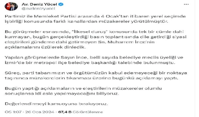 Doğa Başak ÖZTÜRK/ ANKARA, (DHA)- CHP Genel Başkan Yardımcısı Deniz Yücel, Memleket Partisi Genel Başkanı Muharrem İnce'nin 2 partinin müzakerelerinde, CHP'den belli sayıda belediye meclis üyeliği ve İzmir'de bir metropol ilçe belediye başkanlığı talep ettiğini açıkladı.