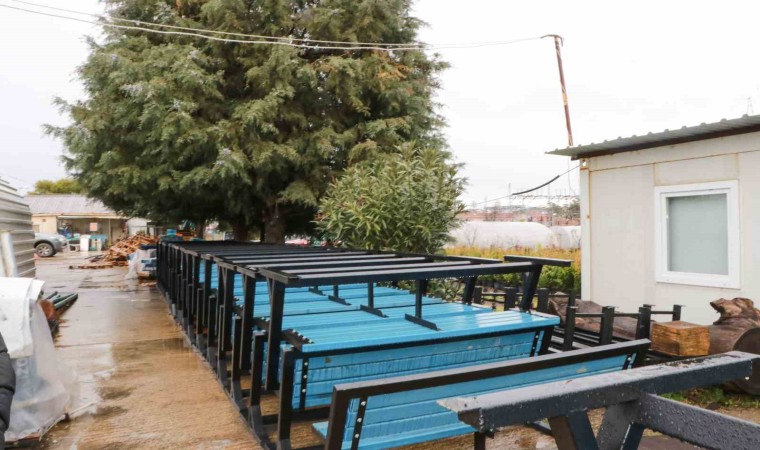 Çiftlikköy’ün yürüyüş alanları, mesire alanları ve parklarında kullanılacak olan kamelya, piknik masaları ve oturma alanlarının üretimi Çiftlikköy Belediyesi’nin Park ve Bahçeler Müdürlüğü kaynak atölyesinde üretiliyor.