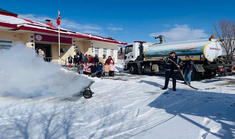 Çıldır Anaokulu tarafından ağırlanan Çıldır Belediyesi itfaiye personeli miniklere yangının ne olduğu, zararları ve nasıl kontrol altına alındığı hakkında bilgi verdi. Yangın anında neler yapılacağı uygulamalı olarak gösterildi.