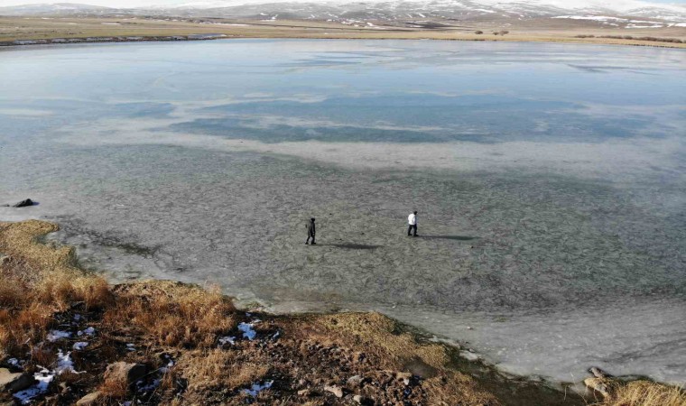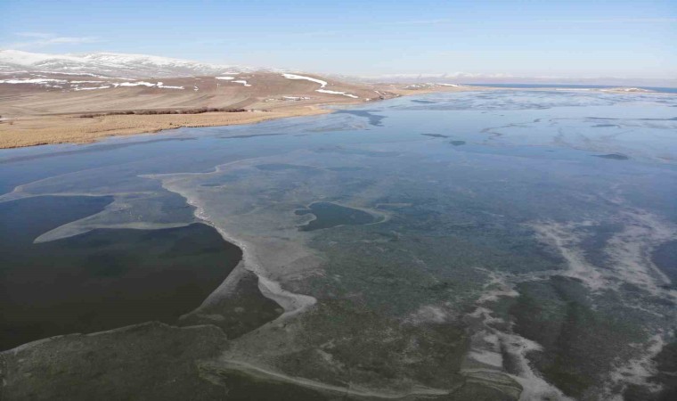 Doğu Anadolu Bölgesi`nin Van Gölü`nden sonra 2’inci büyük gölü olan Çıldır Gölü`nün yüzeyi soğuk hava nedeniyle kısmen dondu.