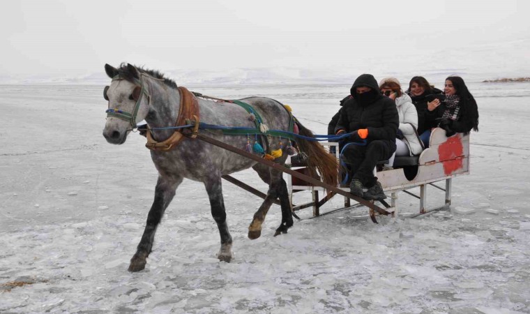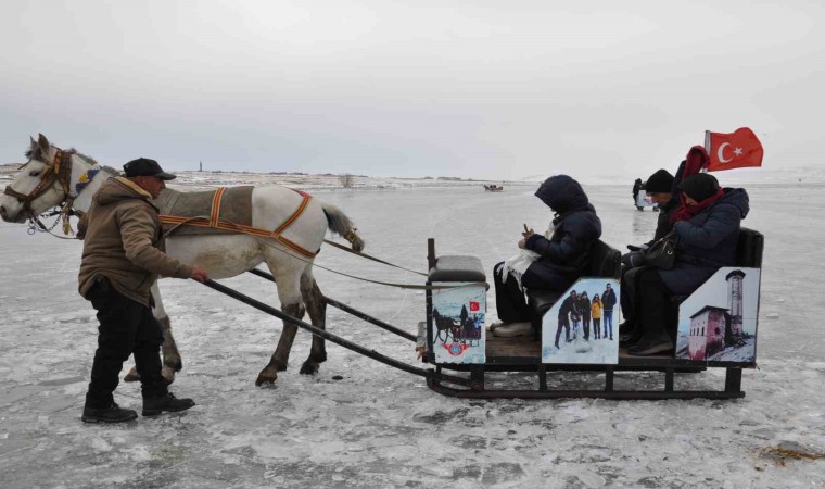 Kars’ın Arpaçay ilçesi sınırlarında bulunan Çıldır Gölü, kış mevsiminde tamamen donarak adeta bir doğal buz pistine döndü. Atlı kızaklar, gölün üzerinde gezinti yapmak isteyen turistler için ise en popüler aktivitelerden biri. Kızakçıların kontrolündeki atlar, gölün buzla kaplanmış yüzeyinde kayarken ziyaretçiler hem manzaranın hem de sessizliğin tadını çıkarıyor.