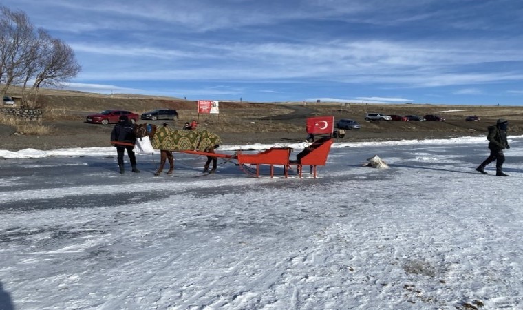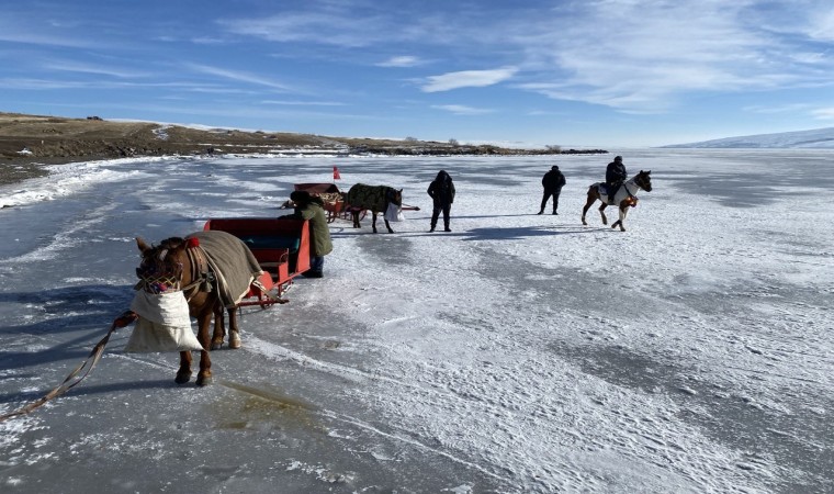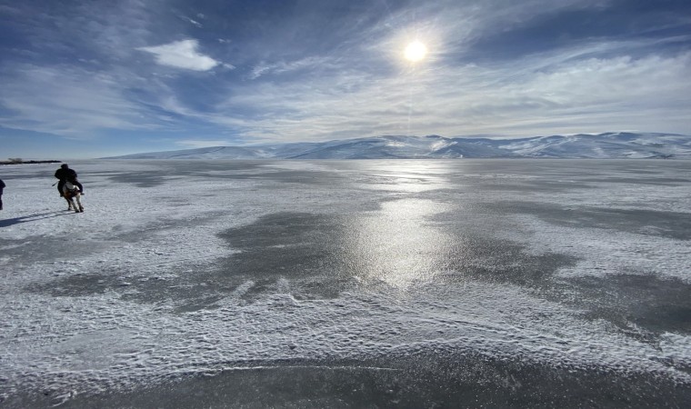 Doğu Anadolu’nun en büyük ikinci gölü olan ve bir bölümü donan Çıldır Gölü’nde atlı kızak keyfi başladı.