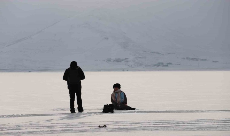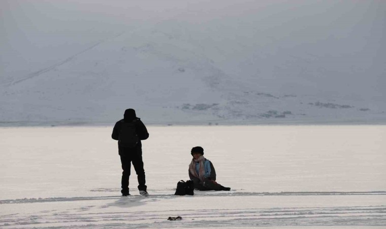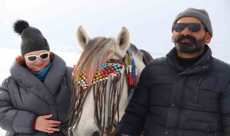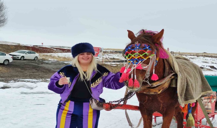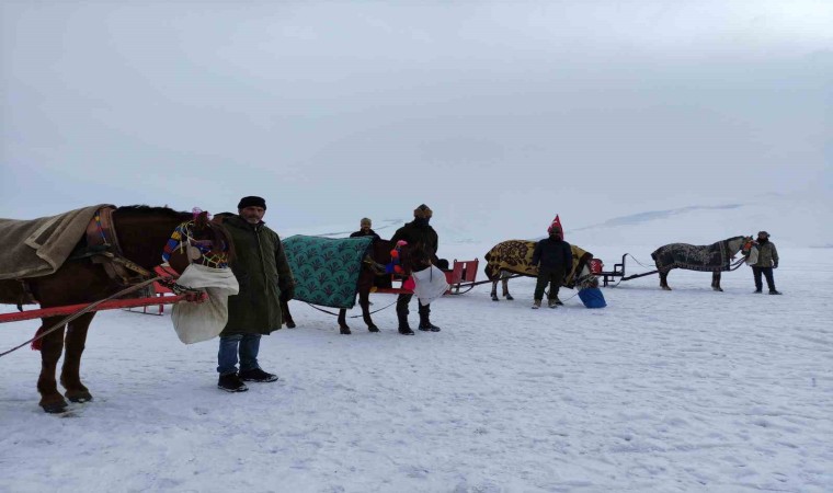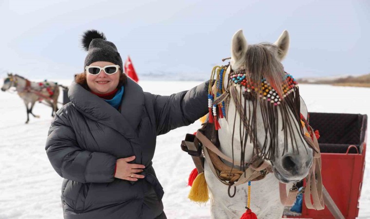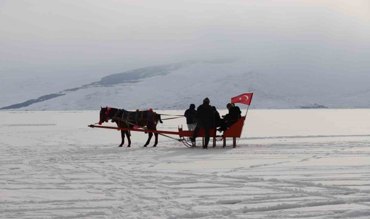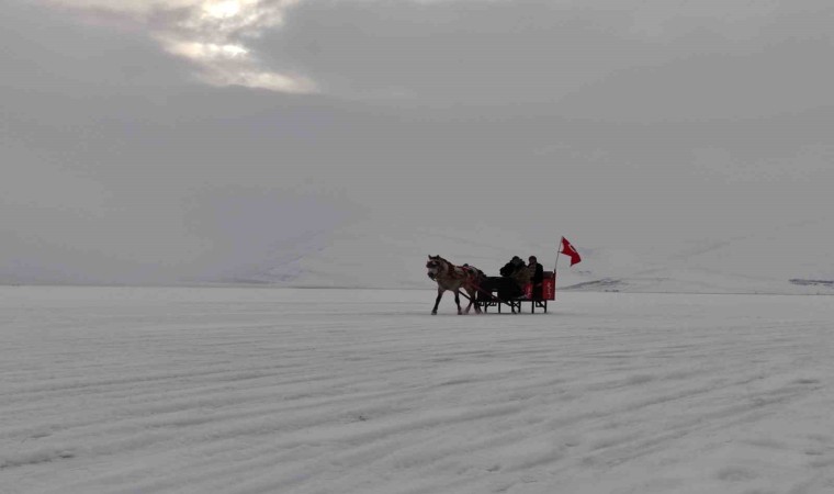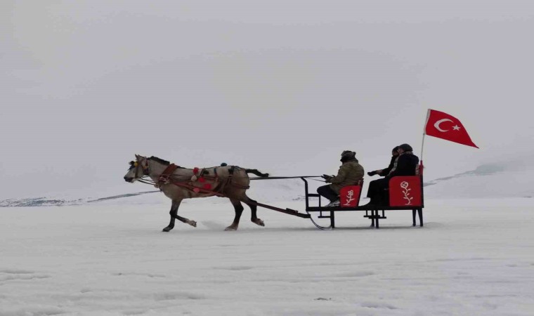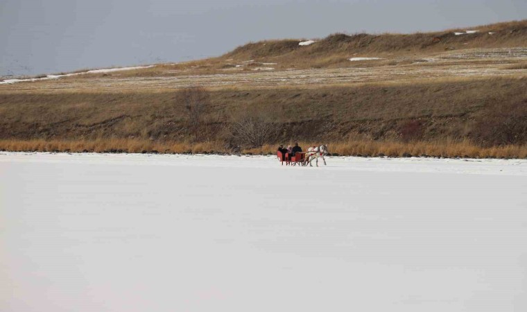 Yüzeyinin tamamı donan Çıldır Gölü’ne gelen yerli ve yabancı ziyaretçiler, gölün üzerinde atlı kızak yaparak keyifli anlar yaşadı.