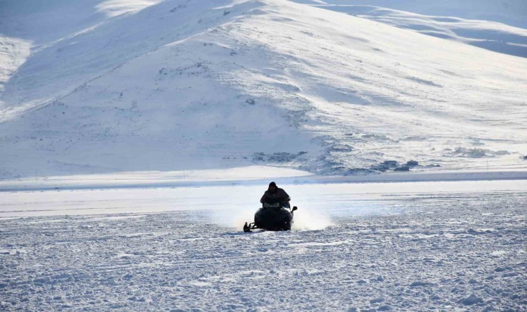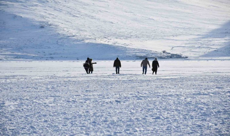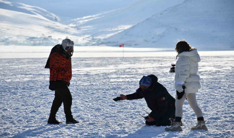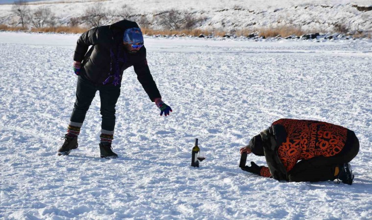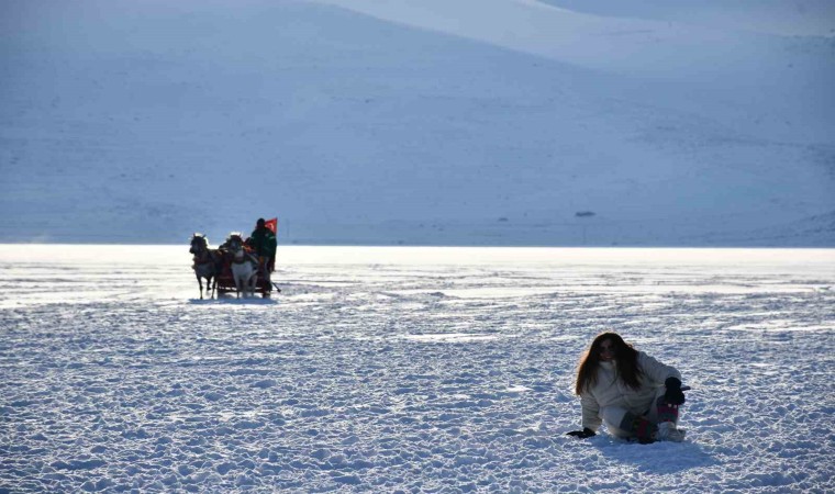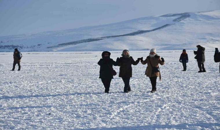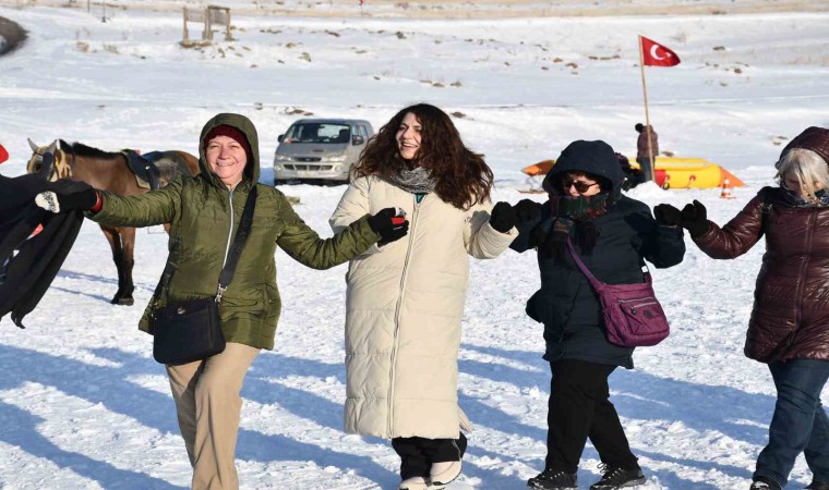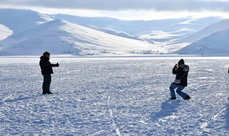 Beyaz örtü arasındaki maviliğin güzel manzaralar oluşturduğu Çıldır Gölü’ne gelen turistler, karlı dağların bulunduğu alanda doyasıya eğleniyor.