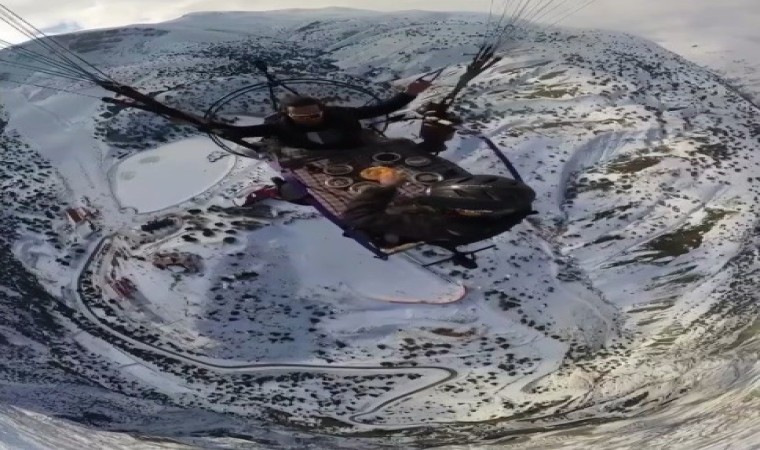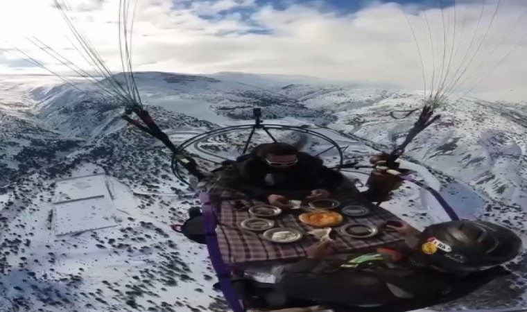 Aynı zamanda YouTuber olan yamaç paraşütü pilotu Hasan Kaval, özel olarak hazırladığı düzenek sayesinde paraşütüne bağladığı masada semaver çayı eşliğinde Erzincan’a has tulum peyniri ve yöresel ürünlerle gökyüzünde kahvaltı yaptı.