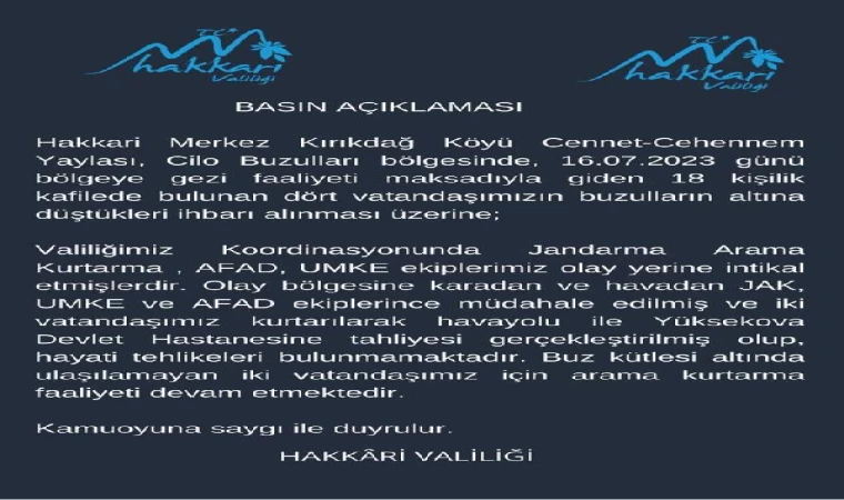 "Hakkari Merkez Kırıkdağ Köyü Cennet-Cehennem Yaylası, Cilo Buzulları bölgesinde, 16.07.2023 günü bölgeye gezi faaliyeti maksadıyla giden 18 kişilik kafilede bulunan dört vatandaşımızın buzulların altına düştükleri ihbarı alınması üzerine; Valiliğimiz Koordinasyonunda Jandarma Arama Kurtarma, AFAD, UMKE ekiplerimiz olay yerine intikal etmişlerdir. Olay bölgesine karadan ve havadan JAK, UMKE ve AFAD ekiplerince müdahale edilmiş ve iki vatandaşımız kurtarılarak havayolu ile Yüksekova Devlet Hastanesine tahliyesi gerçekleştirilmiş olup, hayati tehlikeleri bulunmamaktadır. Buz kütlesi altında ulaşılamayan iki vatandaşımız için arama kurtarma faaliyeti devam etmektedir." (DHA)