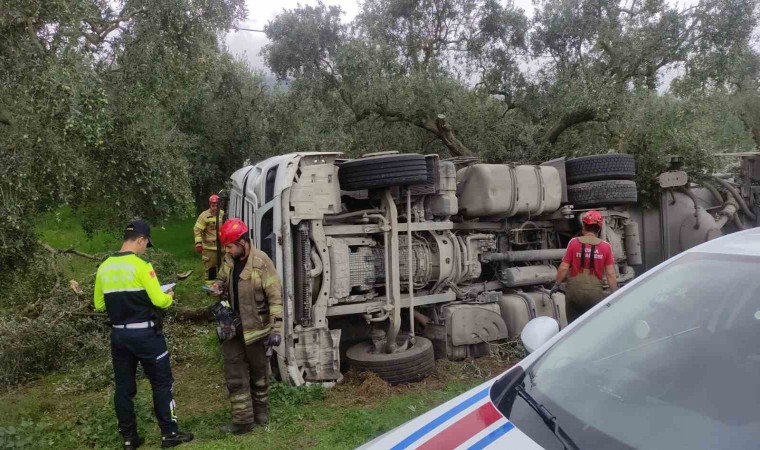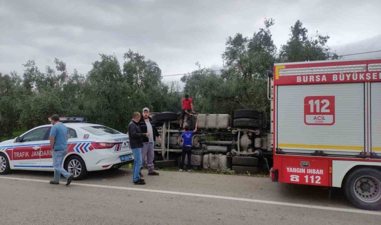 Bursa’nın Orhangazi ilçesi İznik yolu üzerinde çimento malzemesi yüklü bir tanker kontrolden çıkarak zeytinliğe devrildi. Zeytin ağaçlarını parçalayarak duran tırın sürücüsü yaralandı.