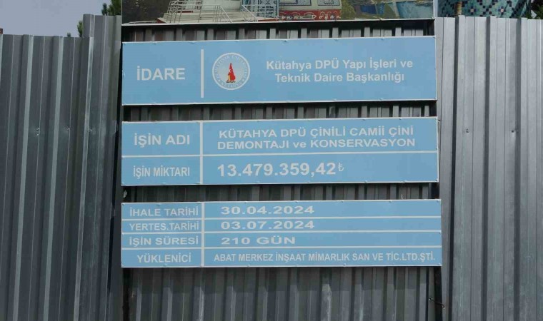 Caminin iç ve dış çinileri, DPÜ Yapı İşleri Teknik Yapı İşleri ve Teknik Daire Başkanlığı tarafından yapılan ihaleyi kazanan Abat Merkez İnşaat Mimarlık firması tarafından 210 günde 13 milyon 479 bin 359 TL’ye sökülecek. Sökülen çinilerin Ahmet Yakupoğlu Müzesi’nde sergilenmesi planlanıyor. Çalışma nedeniyle caminin etrafı dev çelik panolarla kapatılırken, firma çalışanları da bölgede adeta kuş uçurtmuyor.