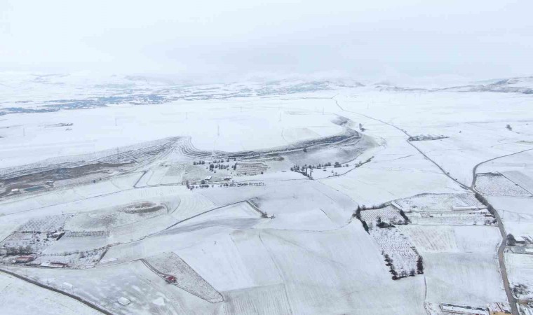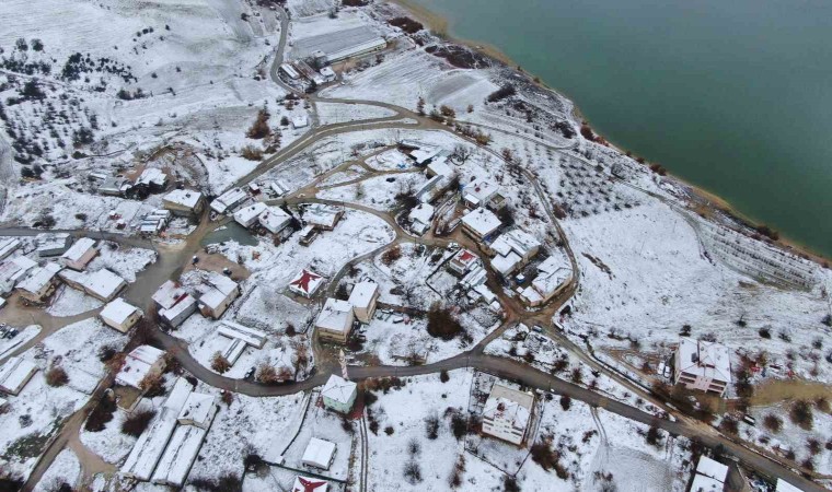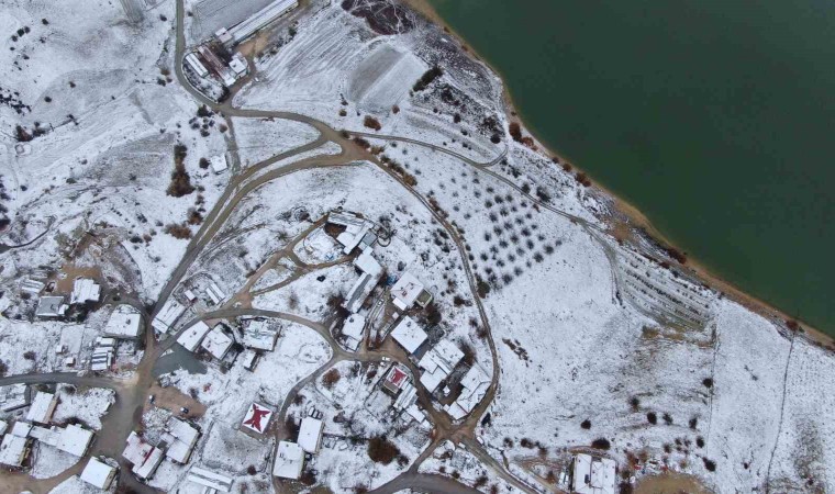 Elazığ’a 13 kilometre uzaklıktaki Cip Baraj Gölü, kar yağışıyla beyaza büründü. Havadan görüntülenen göl ve çevresinde, kış mevsiminin etkisiyle eşsiz bir görünüm oluştu.