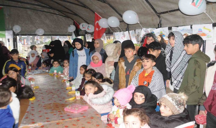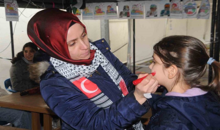 Filistin ve Kudüs resimlerinin yapıldığı etkinlikte çocuklara balon ve bayraklar dağıtıldı.
