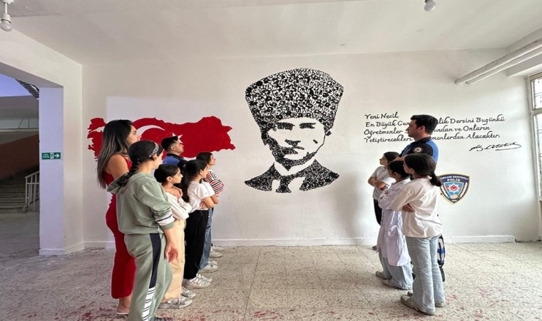 Ekipler, öğrenci ve öğretmenlerle birlikte ay yıldızlı Türkiye haritasının yanında el izleriyle Atatürk portresinin altına sözünü ve imzasını attı.