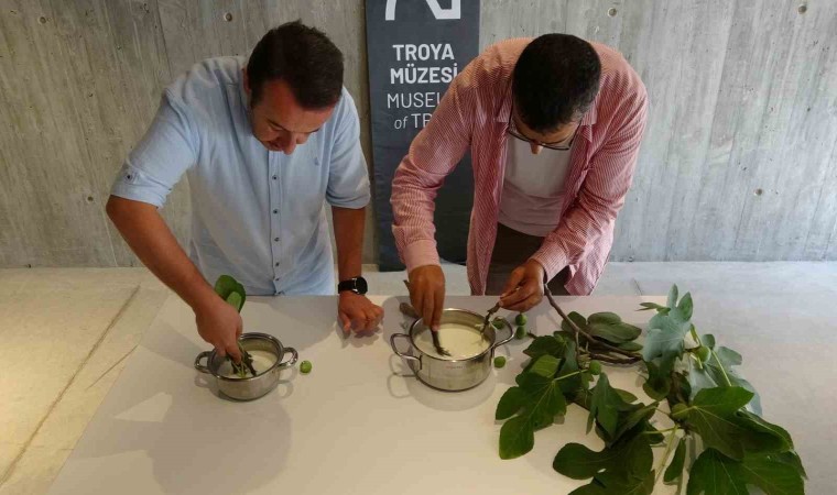 Troya Müze Müdürü Rıdvan Gölcük, Troya Müzesinde keçi sütü ve incir sütünden yapılan ‘Teleme’yi uygulamalı olarak yaptı. Yaklaşık 5 dakika içinde keçi sütü ile incir sütünün ve incir yaprağının karışımı sonucu yoğurt kıvamında ortaya çıkan ‘Teleme’nin 2 bin 750 yıl önce Troya Savaşları’nı anlatan Homeros’un İlyada Destanı’nda yer aldığını belirten Müdür Rıdvan Gölcük, “Geçtiğimiz haftalarda Homeros’un İlyada’sında Gastronomiye ilişkin neler bulabiliriz. Bu doğrultuda bir çalışmaya başlamıştık. Çalışma sırasında aslında hiç beklemediğimiz bir keşif yaşadık. Keşif şuydu, İlyada’da savaş tanrısı Ares yaralanıyor ve yarasının ne kadar hızlı iyileştiğini göstermek için Homeros bir örnek veriyor. Diyor ki, ‘Ak süte incirin sütünü damlatırsın ya, karıştırırsın ya hani ve çabucak göz önünde mayalanı verir hemen’ ve bunu gördüğümüzde incirin sütüyle süt mayalanır mı, bu gerçekleşebilir mi. Açıkçası çok şaşırdık bu satırları okuduğumuzda ve hemen bir araştırmaya girdik. Daha sonrasında şunu gördük. Anadolu’da özellikle yörükler arasında Adana, Hatay, Mersin civarlarında yeni sağılmış keçi sütüne incirin sütü damlatıldığında neredeyse 5-6 dakika içerisinde bir mayalanma olduğu ve yapısal olarak yoğurda benzeyen ortaya bir ürün çıktı. Bu ürüne de ‘Teleme’ adı verildiğini gördük ve Homeros’un aslında bahsettiği şeyin bugün Anadolu’da çoban aşı ya da teleme olarak bilinen ürünün tarifi olduğunu gördük ve hemen bunu denemeye başladık. Keçi sütü aldık. Keçi sütüne incir sütü damlatarak ya da incirin dalıyla karıştırarak mayalanıp, mayalanmadığını görmeye çalıştık ve neredeyse sadece 5 dakika içerisinde bir mayalanma gerçekleşti. Yani Homeros destanında bahsedilen 2750 yıllık tarifle bir teleme yaptık. Anadolu’daki telemenin tarifinin Homeros’ta yer aldığı yani bu 2700 yıllık metinde yer aldığı bugüne kadar bilinmiyordu. Dolayısıyla bu ilk yeni bir keşif oldu. Araştırmalar sonunda şunu gördük. İncirin sütü aslında bir nevi bir lateks ve fisin denilen bir madde ve keçi sütünü kestiren şey tam da bu maddenin kendisi. Yani dolayısıyla bugüne kadar bu arada ‘teleme’ ya da Homeros’taki bu tarif batıda hiç bilinmiyor. Yani incirin sütüyle keçi sütünün mayalanabileceği hiç bilinmiyorken, Homeros Destanında yer alan bu ‘Teleme’nin neredeyse 3 bin yıldır devam ediyor olması, Homeros metninin Anadolu ile nasıl kuvvetli bir bağı olduğunu gösteriyor” dedi.