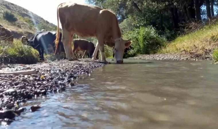 Yozgat’ta öğle saatlerinde 30 dereceyi geçen hava sıcaklığı hayvanları olumsuz yönde etkiliyor. Çobanlar merada otlayan hayvanların üzerine pet şişelerle su dökerek ya da derelere sokarak serinletiyor.