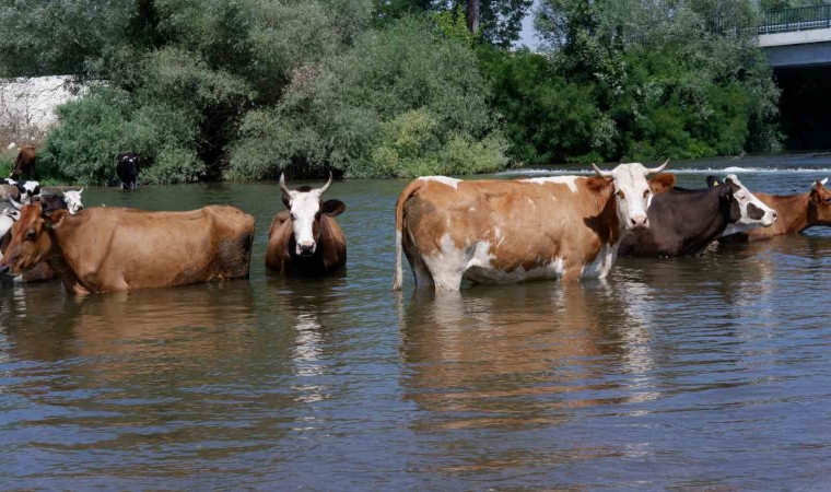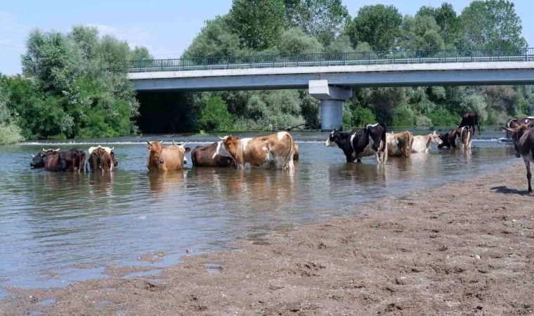Edirne’de çobanlar, sıcak havadan bunalan inekleri Tunca Nehri’nde serinletmeye çalışıyor.