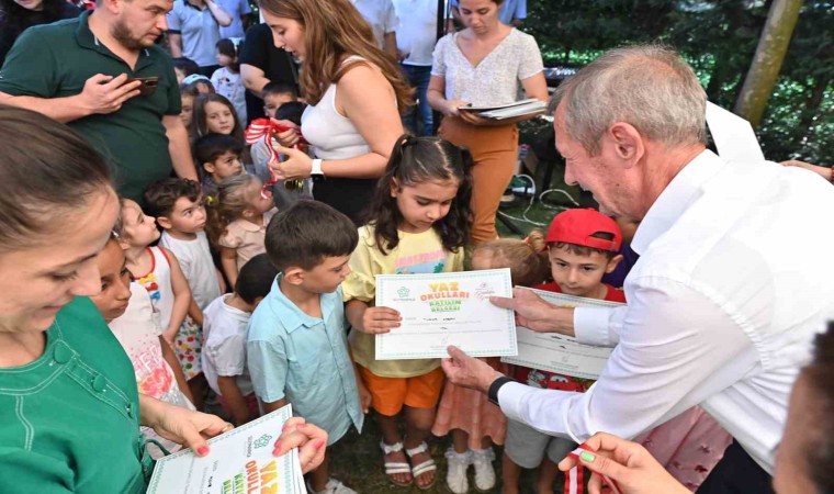 Başkan Uzunlar, 2 aylık eğitim döneminin ardından yaz dönemini tamamlayan minik mezunlara hitap ederek gelecekteki okul hayatlarında başarılar diledi. Konuşmasının ardından Başkan Yardımcısı Çınar ile birlikte öğrencilere diplomalarını ve madalyalarını takdim eden Uzunlar, öğrencileri tek tek tebrik etti.