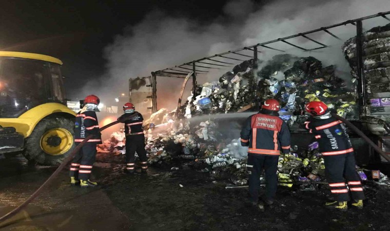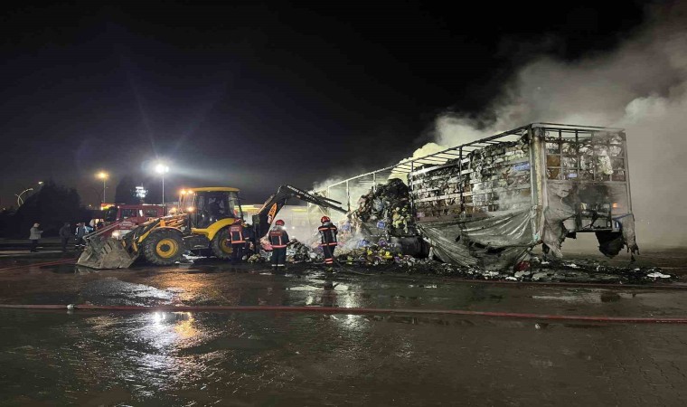 Anadolu Otoyolu’nun Sakarya Hendek ilçesi geçişinde bulunan bir dinlenme tesisinde çocuk bezi yüklü tırın dorsesi alev alev yandı. Yangın, itfaiye ekiplerinin müdahalesiyle söndürülürken, tır küle döndü.