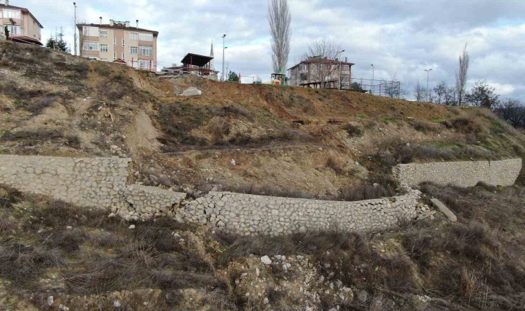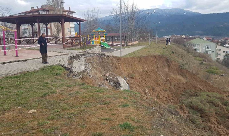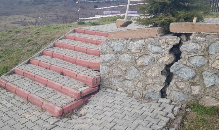 Karabük’te sağanak yağış sonrası çocuk parkında üçüncü kez meydana gelen heyelan nedeniyle parke taşlarla kaplı alan ve merdiven çökerken, istinat duvarında ise çatlaklar oluştu.