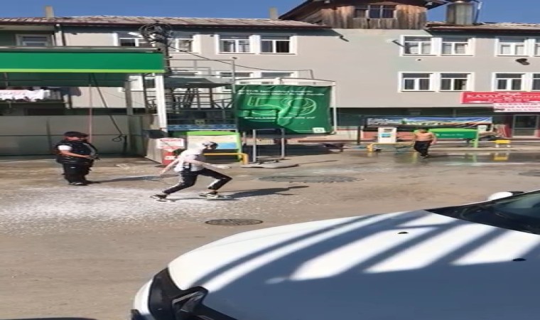 Kocaeli’de sıcaktan bunalan çocukların akaryakıt istasyonundaki köpüğü birbirlerine sıkarak eğlenmeleri ilginç anlara sebep oldu.