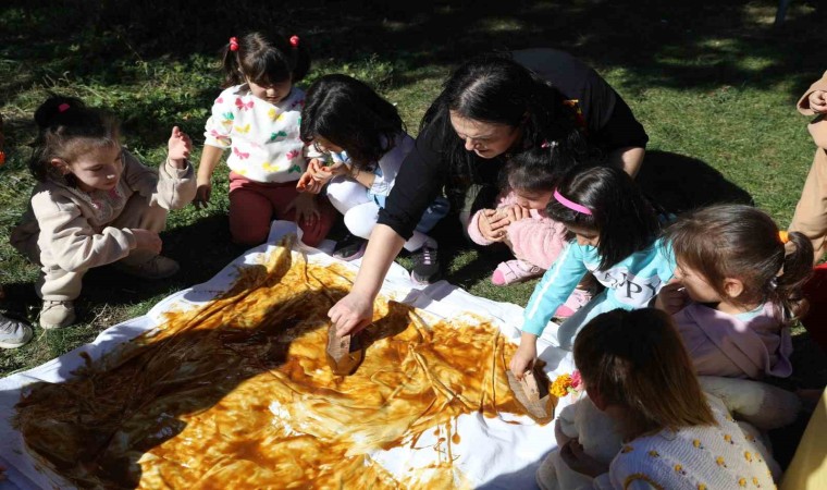Çocuklar, cevizli sucuk ve pestil yapımına katılarak hem üretmenin mutluluğunu yaşadı hem de gönüllerince eğlendi.