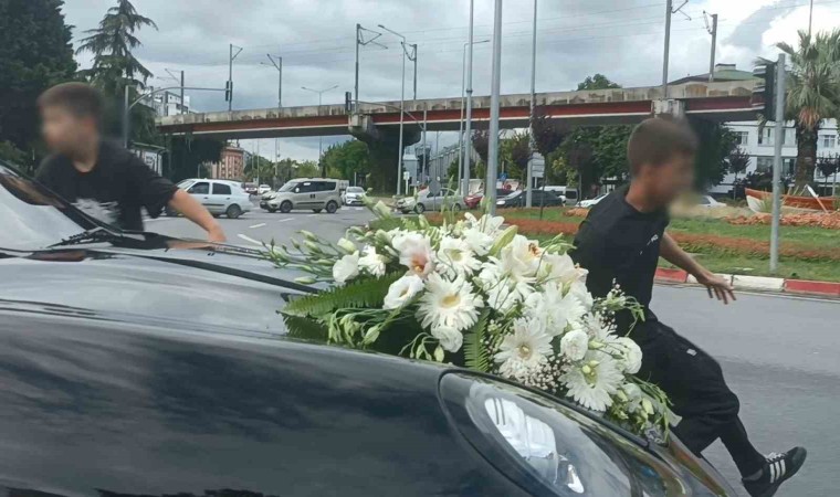 Düğün konvoylarında yaşanan tehlikeli manzaralardan biri de Samsun’da gerçekleşti. İlkadım ilçesi Liman Mahallesi Gençlik Parkı mevkisinde 3 milyon TL değerindeki lüks gelin arabasının önünü kesen 6 çocuk, dakikalarca damattan bahşiş istedi. Bekledikleri zarfı alamayan çocuklardan bazıları arabanın önüne geçerek, otomobilin hareket etmesini engellemeye çalıştı.