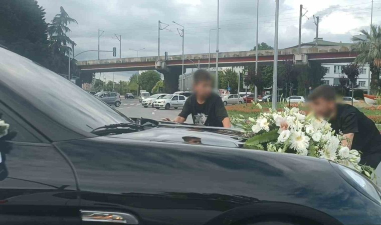 Samsun’da damattan bahşiş almak için gelin arabasının önünü kesen çocuklar, canlarını tehlikeye atmalarına rağmen bahşiş alamadılar. Kaputa yapışan çocuklardan biri, lüks gelin aracının altında kalmaktan son anda kurtuldu.