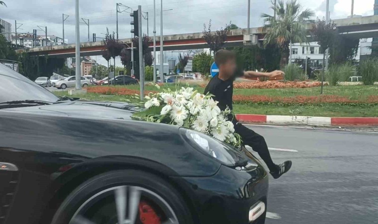 Belli bir süre çocukların otomobilin kaputundan ayrılmasını bekleyen şoför, arkadaki araçların sabırsızlanmasıyla çocukların kaputta olmasına aldırmadan hareket etti. Birden hızlanan lüks arabanın önünde kalan bir çocuk ise metrelerce kaputa tutunarak yolculuk ettikten sonra kendisini otomobilin soluna atarak aracın altında kalmaktan kurtuldu. Son anda kurtulan çocuğun yaşadığı panik yüzündeki ifadeye yansırken, lüks gelin aracı ise Atakum istikametine doğru devam etti.