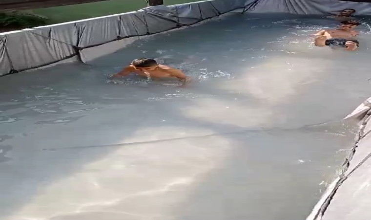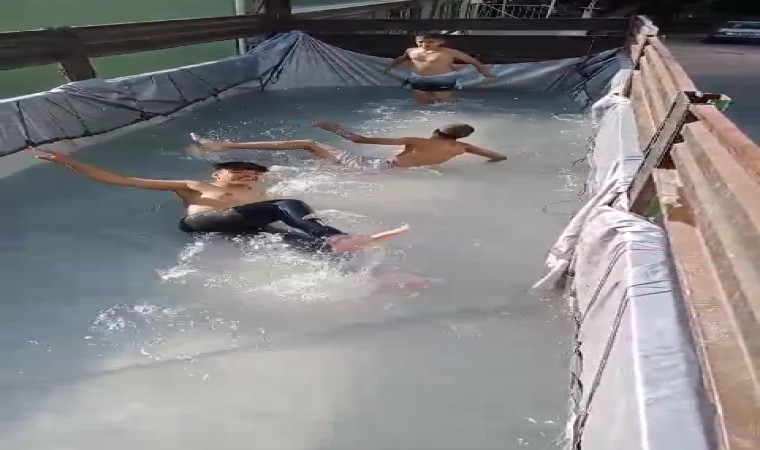 Bursa’nın merkez Osmangazi ilçesi Küçükbalıklı Mahallesi’nde çocuklar, hava sıcaklığının iyice artmasından bunalarak bir kamyonetin dorsesini havuza çevirdi. Dorseye muşamba seren çocuklar daha sonra dorseyi su ile doldurdu. Doldurdukları suda yüzen çocukların sevinci amatör kamera ile kaydedildi.