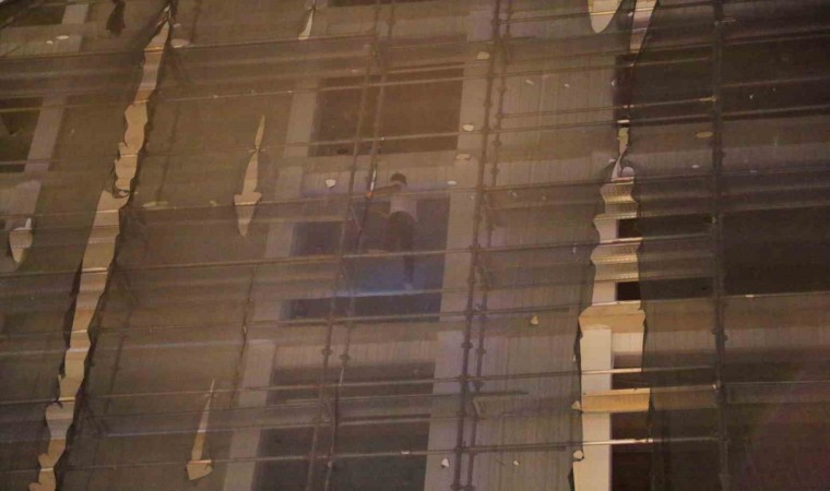 7 katlı inşaatın 5’inci katında binanın dış iskelesinde şahsı bulan polis ekipleri, uzun süre şahsı ikna etmek için uğraştı. İsminin Süleyman olduğu öğrenilen şahsın, polislere eşinin çocukları ile birlikte Kadın Sığın Evi’nde olduğunu ve çocukları göstermediğini, kendisine yardımcı olunması halinde ineceğini belirttiği öğrenildi. Polislerin kendisine yardım sözü vermesi üzerine iskeleden inen şahıs, ifadesi alınmak üzere polis merkezine götürüldü. Şahsın binadan inişi sırasında yüzünün gözükmemesi için inşaatın bekçisi tarafından şapka verildiği görüldü.