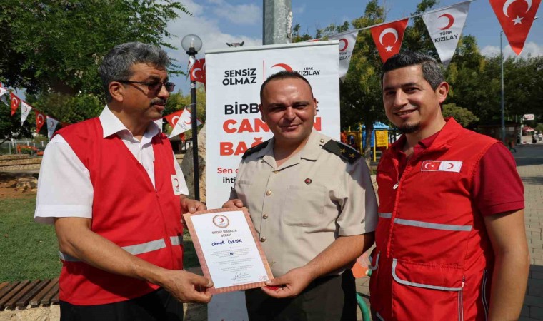 Adana’nın Kozan ilçesinde 36 kez kan veren polis Mehmet Bozoğlan ile 13 kez kan veren Üsteğmen Samet Gedik’e madalya verildi.