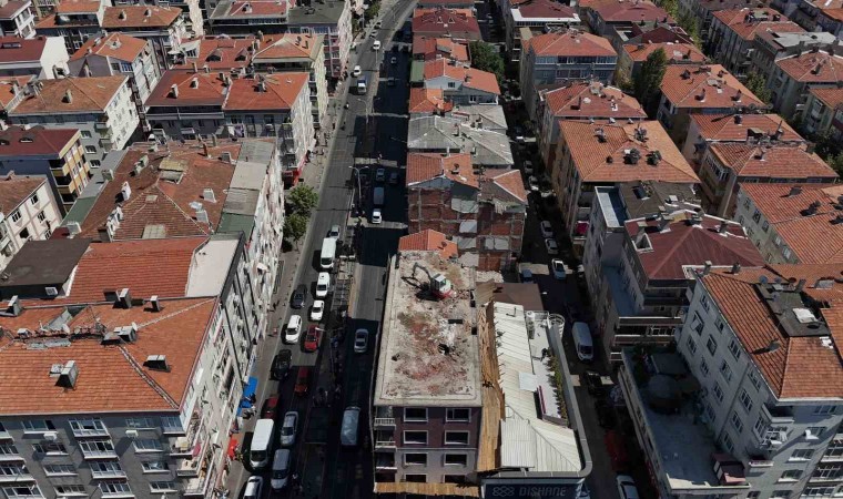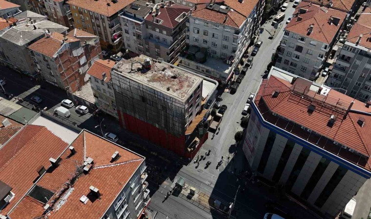 Öte yandan çökme riski bulunan bina ve seferleri durdurulan tramvay hattı havadan görüntülendi.