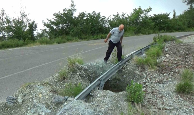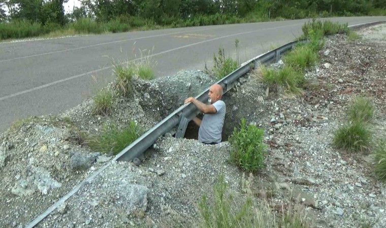 Hatay’da geçtiğimiz günlerde etkili olan kuvvetli yağış sonrası Dörtyol ilçesi Amanos Dağı eteklerindeki asfalt yolun kenarında çökme meydana geldi. Kuzuculu - Üçkoz yayla yolu Karapüren mevkiinden geçen asfalt yolda çökmeyle birlikte yaklaşık 8 metre derinliğinde iç kısmı 4 metre genişliğe sahip olan devasa çukur oluştu. Kendiliğinden ortaya çıkan çukur, doğa tutkunu Nazım Sönmez tarafından fark edildi. Yol kenarında olması sebebiyle tehlike arz eden çukur merak uyandırdı.