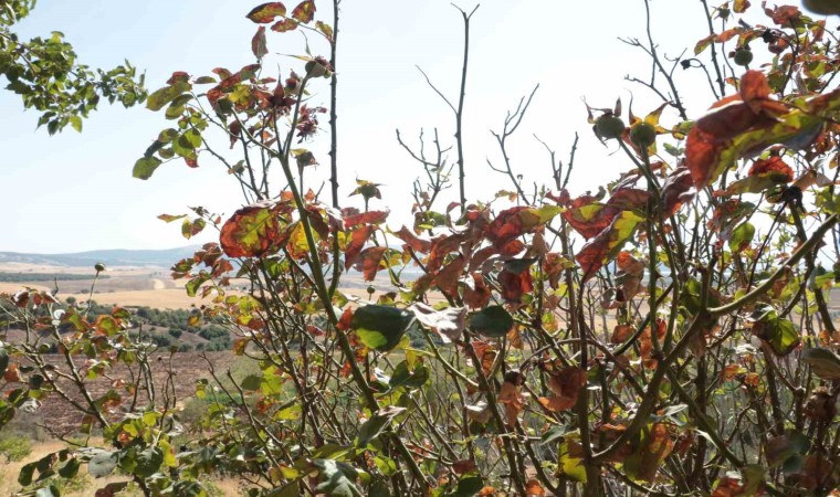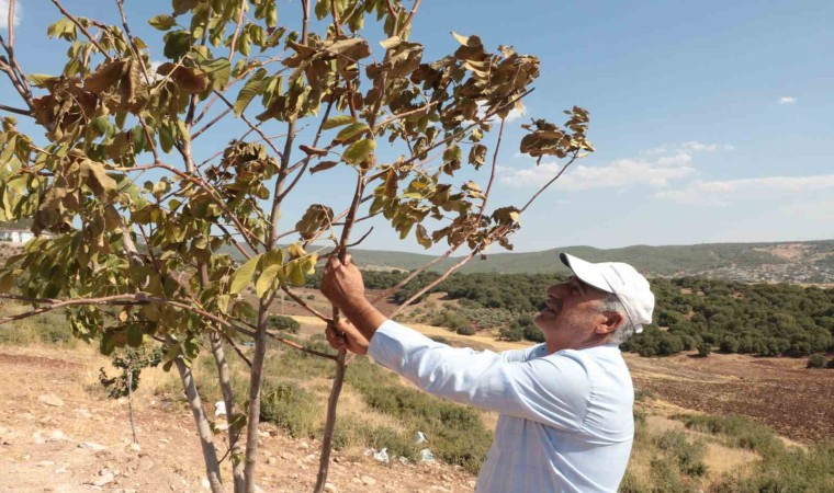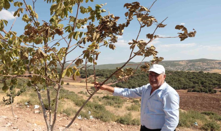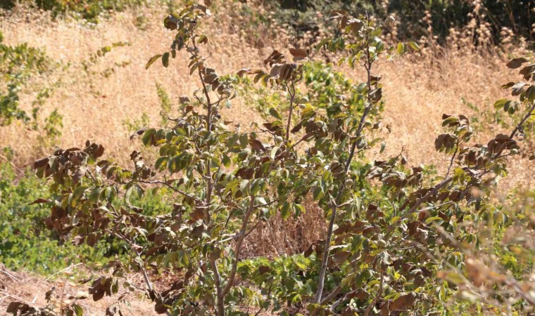 Çöl sıcaklarının etkisi altında kalan Kahramanmaraş’ta bir vatandaşın bahçesindeki ağaçlar, sıcak havalar nedeniyle kurumaya başladı.