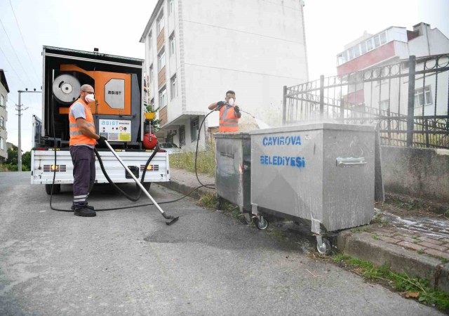 ÇAYIROVA BELEDİYESİ TEMİZLİK İŞLERİ MÜDÜRLÜĞÜ'NE BAĞLI EKİPLER, KONTEYNER YIKAMA ARACIYLA, İLÇE GENELİNDEKİ ÇÖP KONTEYNERLERİNİ YERİNDE YIKIYOR.