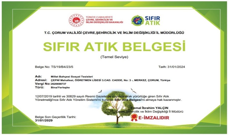 Çorum Belediyesi Sosyal Tesisleri, Sıfır Atık Yönetim Sistemi ile istenen kriterleri yerine getirerek, Çevre, Şehircilik ve İklim Değişikliği Bakanlığından “Sıfır Atık Belgesi" aldı.