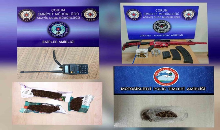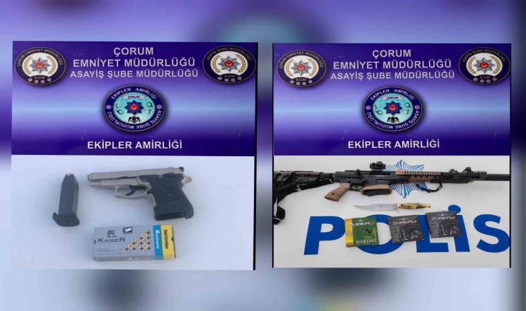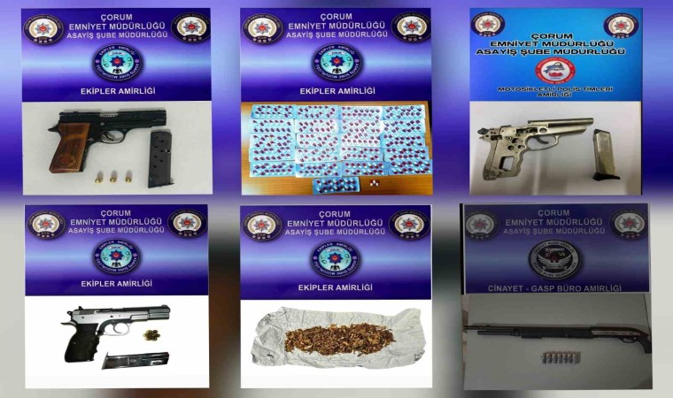 Çorum’da polis ekiplerince gerçekleştirilen şok uygulamada çok sayıda silah ve uyuşturucu madde ele geçirildi, haklarında arama kararı bulunan 2 kişi ise yakalandı.