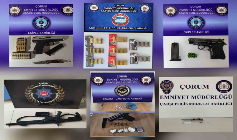 Çorum’da polis ekiplerince gerçekleştirilen şok uygulamada haklarında arama kararı bulunan 5 kişi yakalanırken çok sayıda silah ve uyuşturucu madde ele geçirildi.