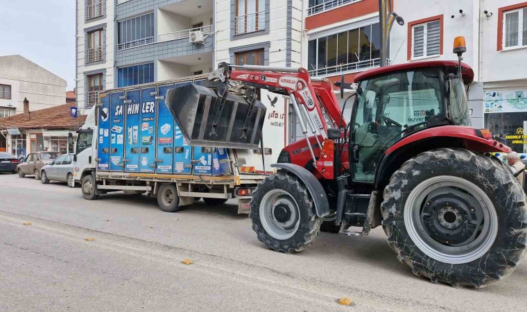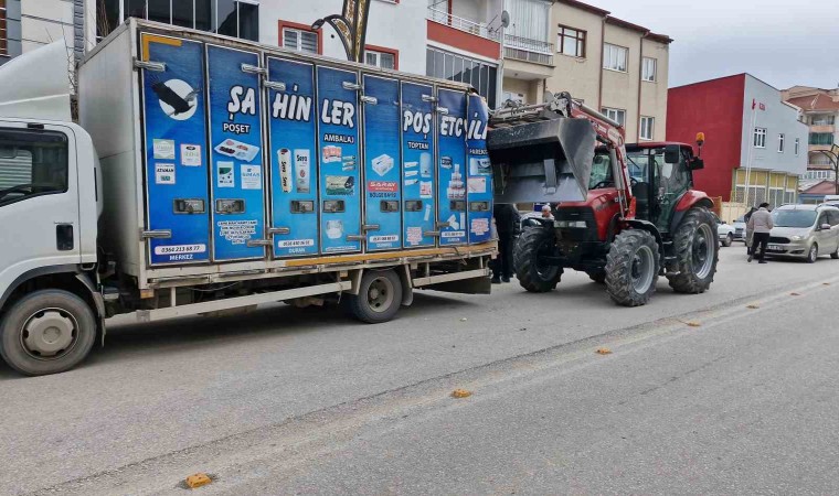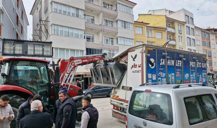 Çorum’un Alaca ilçesinde traktör kepçe, seyir halindeki kamyonete arkadan çarptı.