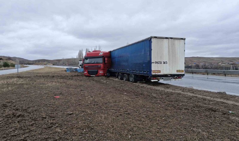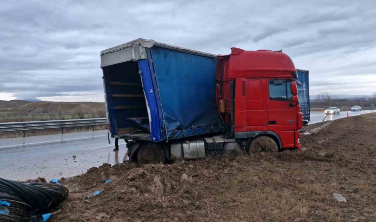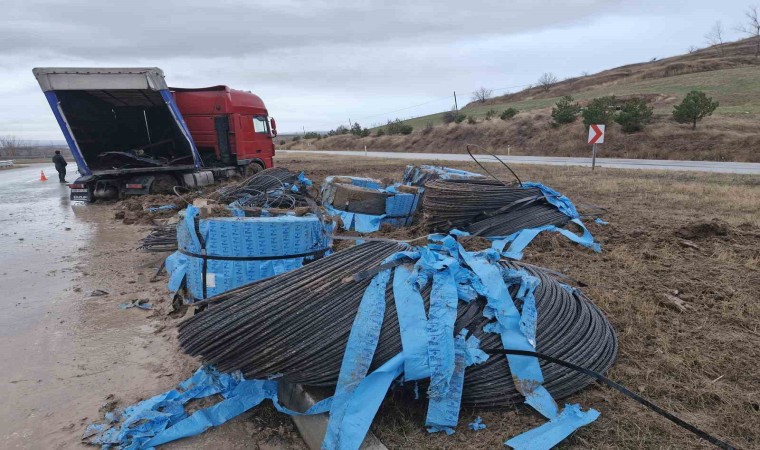 Çorum’un Alaca ilçesi yakınlarında, sürücüsün kontrolünden çıkan çelik halat yüklü tır orta refüje çıktı.
