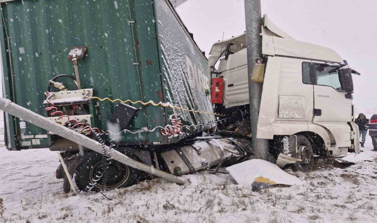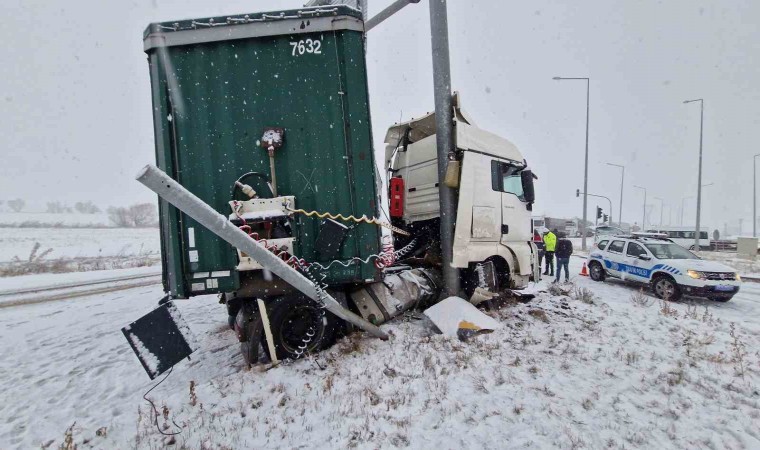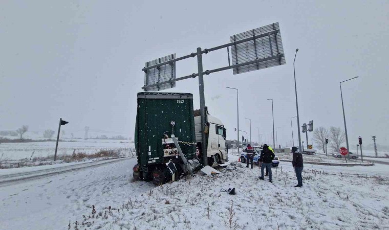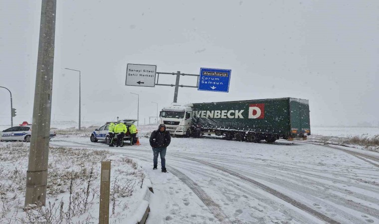 Çorum’da sabah saatleri itibari ile kar yağışı etkili olmaya başladı. Karlı yolda makaslayan bir tır ise tabela direğine çarparak durabildi.