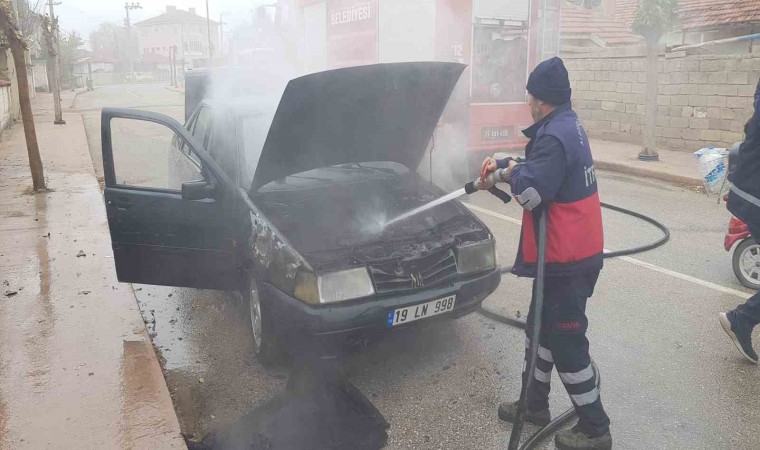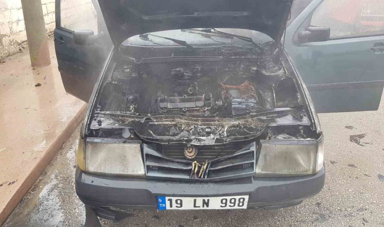 Çorum’un Alaca ilçesinde park halinde bulunan bir otomobil, motor kısmında çıkan yangın sonucunda yandı.