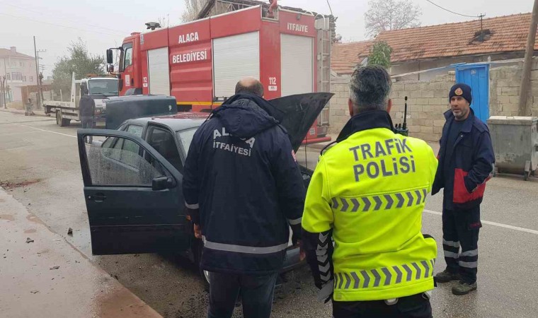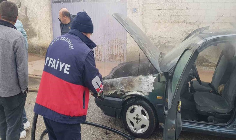 Olay sabah saatlerinde Özkan Mahallesi, Cumhuriyet Caddesi üzerinde yaşandı. Cadde üzerinde park halinde bulunan Kaan Öksüz’e ait 19 LN 988 plakalı otomobil motor kısmından alev alarak yanmaya başladı. Otomobilin yandığı gören çevredeki vatandaşlar olayı polis ve itfaiye ekiplerine haber verdiler. Kısa sürede olay yerine gelen Alaca Belediyesi’ne ait itfaiye ekipleri yanan araca müdahale ettiler. Dışardan yaptıkları müdahale ile yangını söndüremeyen itfaiye ekipleri, kazma yardımı ile motor kaputunu açtıktan sonra yangını söndürdüler.