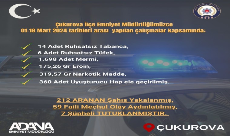 Adana Emniyet Müdürlüğü, Çukurova İlçe Emniyet Müdürlüğüne bağlı devriye, araştırma ekipleri ile çarşı mahalleler bekçileri halkın güvenliğini sağlamak için uygulamalarına devam etti. 1-18 Mart tarihleri arasında yapılan asayiş uygulamaları ile devriye görevi esnasında 6 uzun namlulu ruhsatsız tüfek, 14 ruhsatsız tabanca ve silahlara ait bin 698 mermi ele geçirdi. Yapılan uygulamalarda silahların yanı sıra 175.26 gram eroin, 319,57 gram uyuşturucu madde ve 360 uyuşturucu hap ele geçirildi. Öte yandan çeşitli suçlardan aranan 212 şüpheli yakalanırken bunlardan 7’si çıkarıldığı mahkemece tutuklandı.