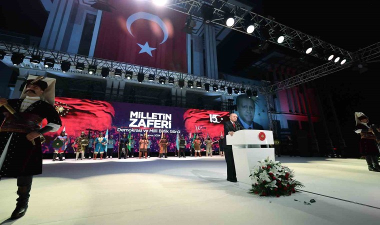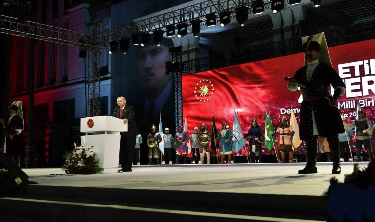 "Her 10 yılda bir demokrasinhen askıya alınmadığı, milli iradenin sürekli varlık-yokluk tehdidiyle yaşamadığı, milletin egemenliğine kast etmeye kimsenin cüret edemediği, dış politikası bağımsız, ekonomisi güçlü, itibarı yüksek, küresel düzeyde çekim merkezi haline gelmiş bir Türkiye’yi inşallah inşa edeceğiz" diyen Erdoğan, "Geçmişteki tecrübelerden ders ve ibret alarak istikbalimizi şekillendireceğiz. Bunun için 15 Temmuz ruhuna sahip çıkmak çok çok önemlidir. Bakınız, bizim nazarımızda, milletin iradesine kast edenler arasında hiçbir ayrım yoktur. Vatandaşa silah doğrultan kim olursa, olsun tıpkı 15 Temmuz gecesi olduğu gibi yine karşısında dimdik dururuz. Milletin sandıkta tecelli eden iradesine, Allah’ın izniyle gölge düşürmeyiz, leke sürdürmeyiz, kimsenin el uzatmasına müsaade etmeyiz. FETÖ’cülerin kendilerini gizlemek için arkasına saklandığı milli-manevi değerlerimizin örselenmesine de izin vermeyiz. Türkiye’nin ve Türk demokrasisinin bir daha asla 27 Mayıs, 12 Eylül, 28 Şubat ve 15 Temmuz vâri saldırılarla karşı karşıya kalmaması için gereken her türlü tedbiri alıyoruz, almaya da devam edeceğiz" ifadelerini kullandı.