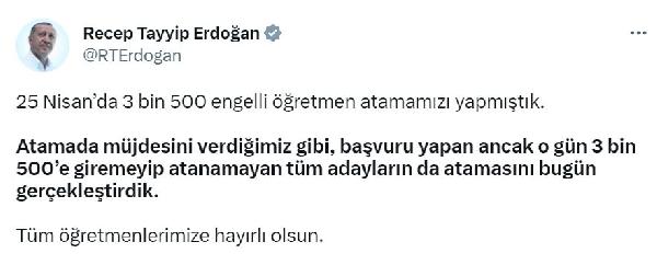 Cumhurbaşkanı Erdoğan, Twitter hesabından yaptığı açıklamada, "25 Nisan’da 3 bin 500 engelli öğretmen atamamızı yapmıştık. Atamada müjdesini verdiğimiz gibi, başvuru yapan ancak o gün 3 bin 500’e giremeyip atanamayan tüm adayların da atamasını bugün gerçekleştirdik. Tüm öğretmenlerimize hayırlı olsun'' ifadelerini kullandı. (DHA)
