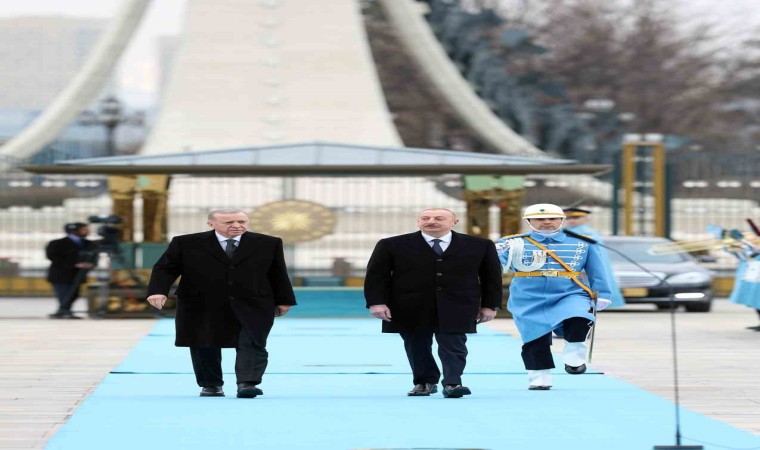 Erdoğan ve Aliyev’in tören alanındaki yerlerini almalarının ardından, 21 pare top atışı eşliğinde iki ülkenin milli marşları çalındı. Aliyev, Muhafız Alayı Tören Kıtası’nı ’Merhaba Asker’ diyerek selamladı. Törende, tarihte kurulan 16 Türk Devletini temsil eden bayraklar ve askerler de yer aldı.