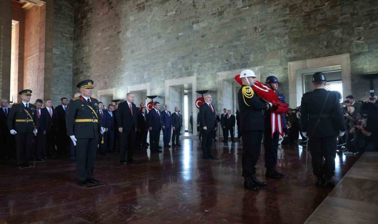Cumhurbaşkanı Erdoğan’ın üzerinde ay yıldız bulunan çelengi Atatürk’ün mozolesine bırakmasının ardından saygı duruşunda bulunuldu ve İstiklal Marşı okundu.